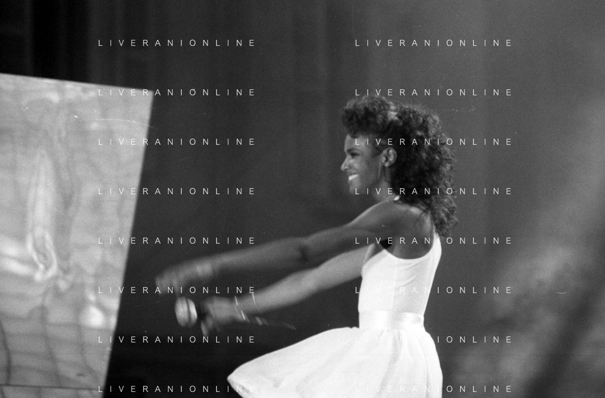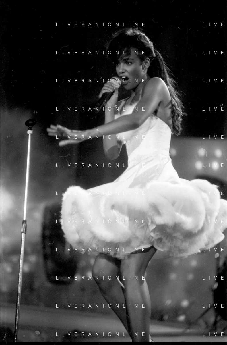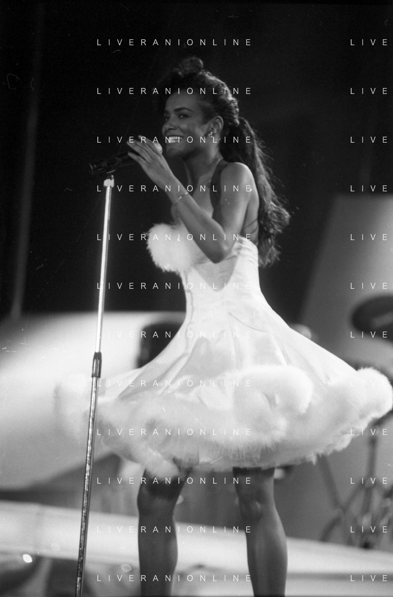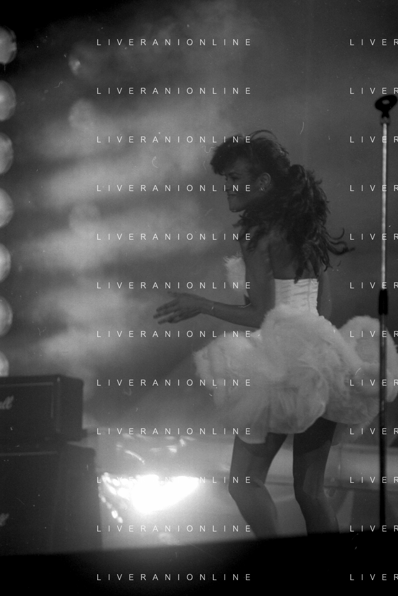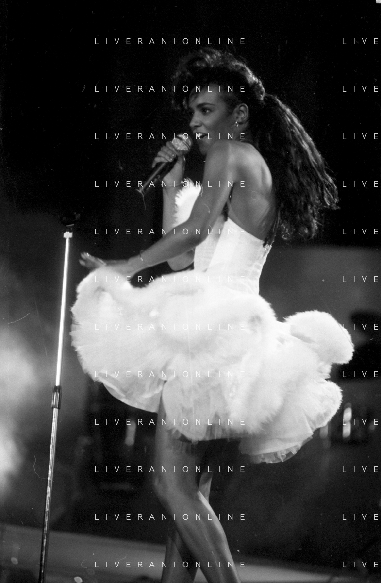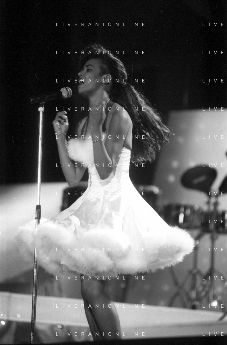 Neg - RETROSPETTIVA TRACY SPENCER CANTANTE NELLA FOTO TRACY SPENCER DURANTE LA PREMIAZIONE AL FESTIVALBAR A VERONA NELL’ANNO 1986, CON GERRY SCOTTI, SUSANNA MESSAGGIO E VITTORIO SALVETTI - AGENZIA ALDO LIVERANI SAS