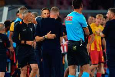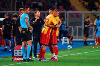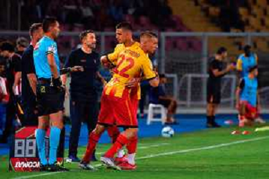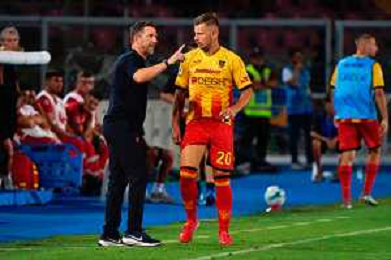 TVEM August 15, 2025 Lecce, Italy - US Lecce vs SS Juve Stabia - Coppa Italia round of 32 match 2025/26 - Via Del Mare Stadium. In the pic: coach Eusebio Di Francesco of US Lecce and Ylber Ramadani of US Lecce ©TVEM Emmanuele Mastrodonato - AGENZIA ALDO LIVERANI SAS
