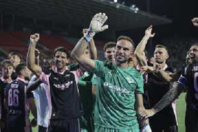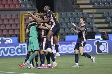 Francesco Bardi of Palermo FC and players jubilates after save the last penalty during US Cremonese vs Palermo FC, 32° leg of Coppa Italia Frecciarossa 2025-26 game at Giovanni Zini stadium in Cremona (CR), Italy, on Agust 16, 2025. (Photo by Davide Casentini)- AGENZIA ALDO LIVERANI SAS