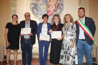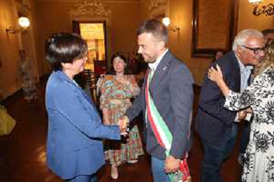 IMOLA 28 08 2025 SINDACO MARCO PANIERI E ASSESSORE ALLA SCUOLA GIANNA GAMBETTI SALUTANO I DIRIGENTI SCOLASTICI VISTA LA CONCLUSIONE DEL LORO SERVIZIO GABRIELE PETRONE IC1,TERESA CUCINIELLO IC6 E ROSSANA NERI IC5 NELLA FOTO DIRIGENTE SCOLASTICO IC6 TERESA CUCINIELLO E SINDACO DI IMOLA MARCO PANIERI ©SANNA - AGENZIA ALDO LIVERANI SAS