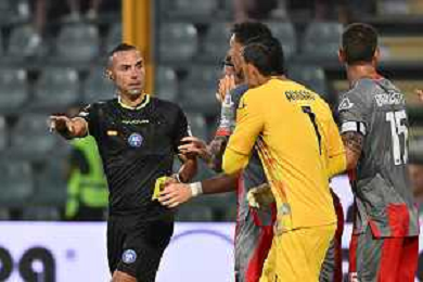 TVRG Cremonese vs Sassuolo nella foto proteste Cremonese con l'arbitro Marco Guida di Torre Annunziata (NA) dopo il rigore assegnato al Sassuolo Cremona 29-08-2025 Stadio Giovanni Zini Cremonese vs Sassuolo Campionato Serie A Enilive - 2a giornata foto Roberto Garavaglia/Agenzia Aldo Liverani sas