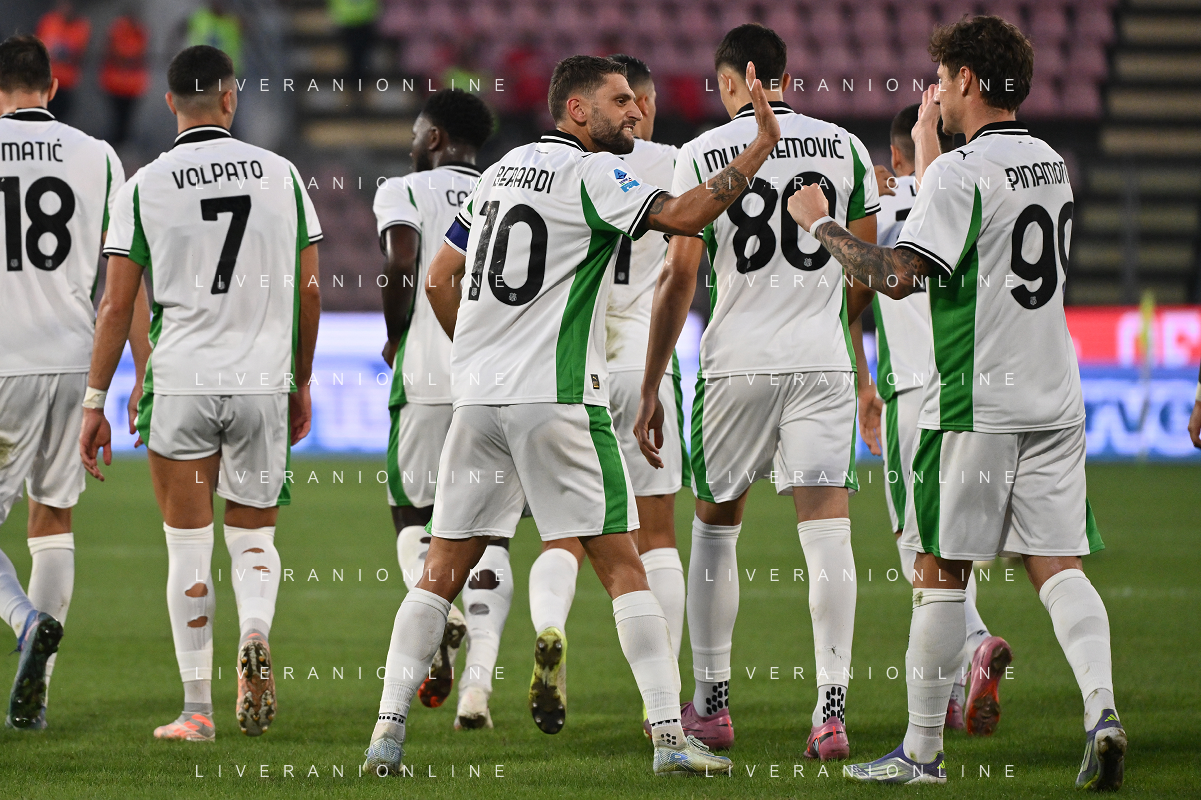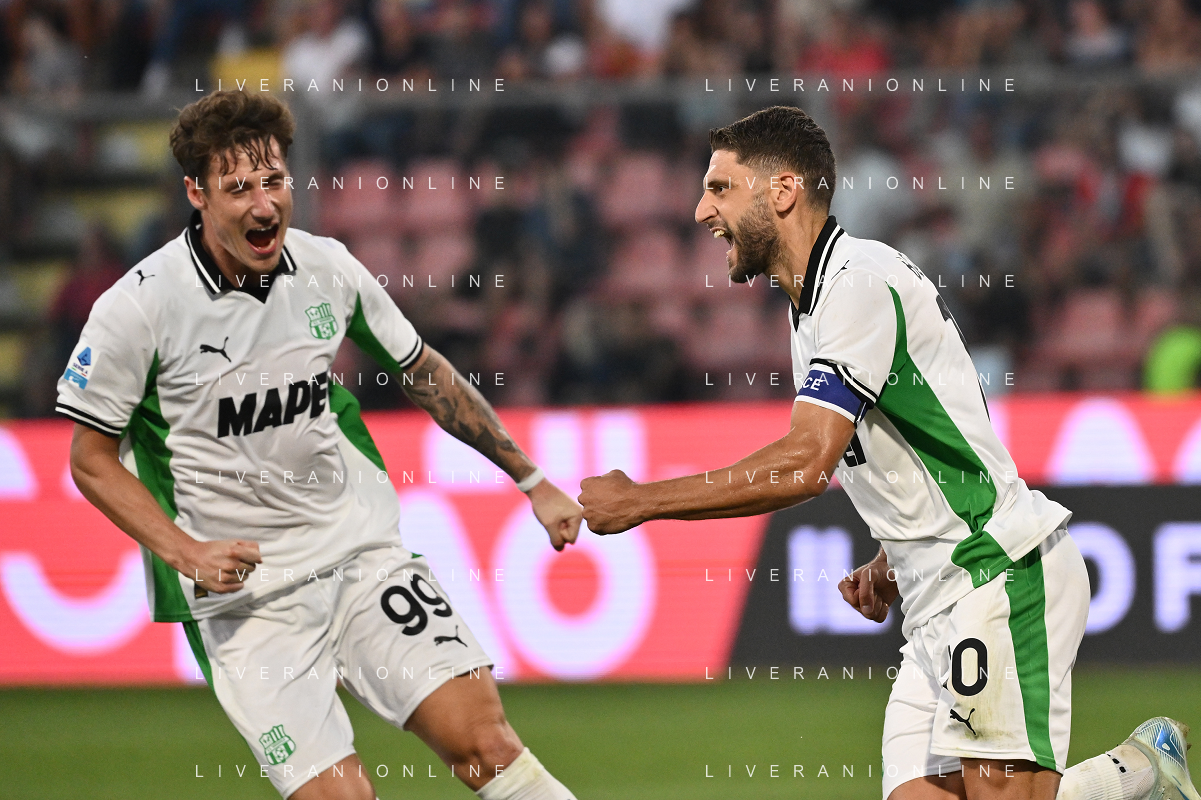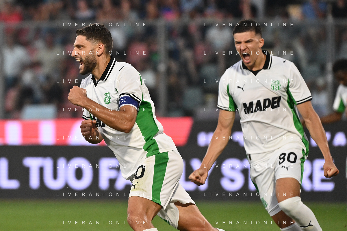 TVRG Cremonese vs Sassuolo nella foto Domenico Berardi (Sassuolo) e Tarik Muharemovic (Sassuolo) esultanza dopo il gol del 2 a 2 Cremona 29-08-2025 Stadio Giovanni Zini Cremonese vs Sassuolo Campionato Serie A Enilive - 2a giornata foto Roberto Garavaglia/Agenzia Aldo Liverani sas