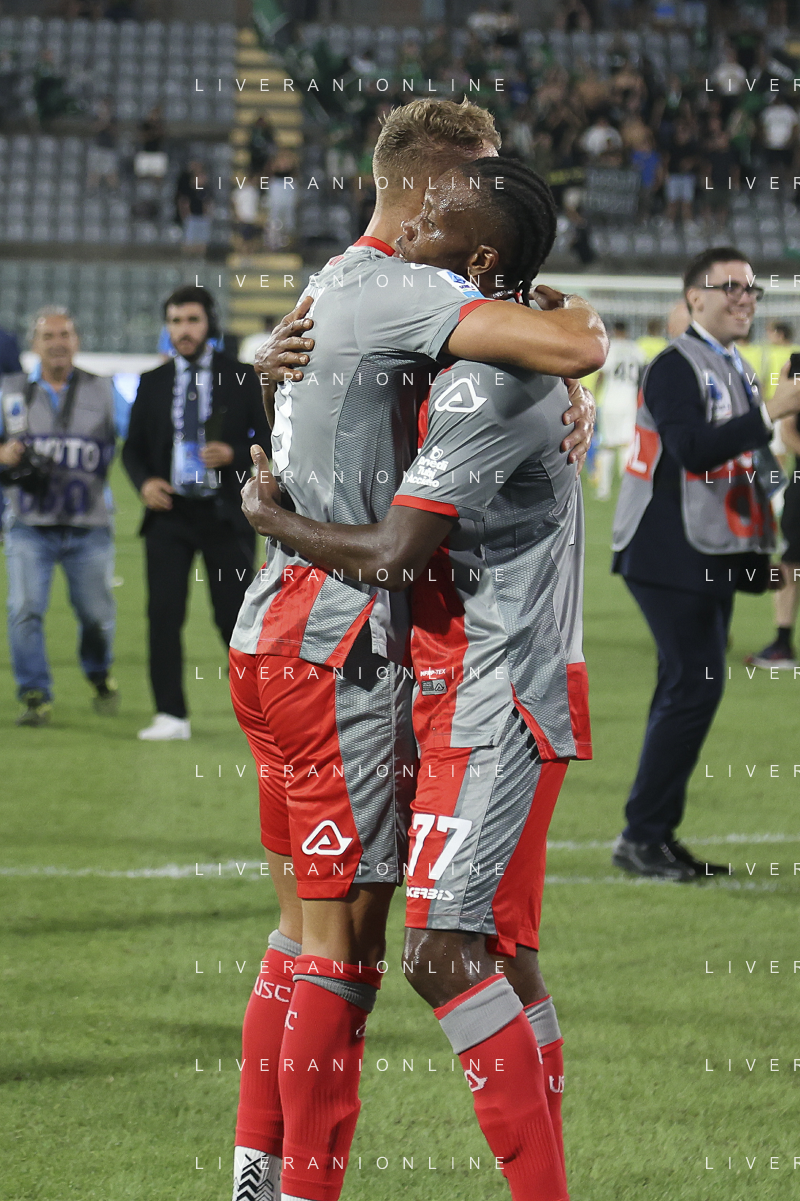 Manuel De Luca of US Cremonese and Chidozie David Okereke of US Cremonese celebrate the victory at the end of US Cremonese vs US Sassuolo, 2° Serie A Enilive 2025-26 game at Renato Zini stadium in Cremona (CR), Italy, on August 28, 2025. (Photo by Davide Casentini) AG ALDO LIVERANI SAS
