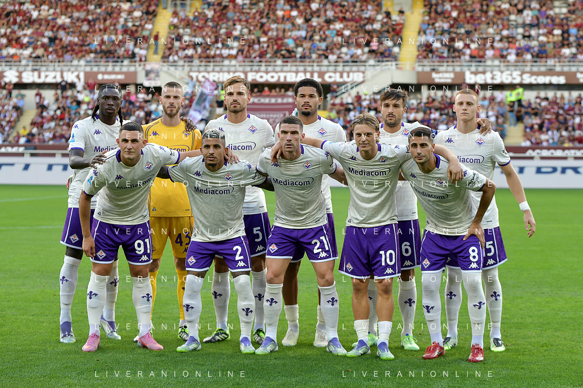 Torino 31.08.25 Stadio Grande Torino @Manuela Viganti/Ag. Aldo Liverani sas Torino vs Fiorentina Campionato Calcio Serie A Enilive 2025/2026 2a giornata Nella foto: la formazione della fiorentina da sx verso dx: moise kean, david de gea, marin pongracic, simon sohm, luca ranieri, pietro comuzzo, roberto piccoli, dodo, robin gosens, albert gudmundsson, rolando mandragora