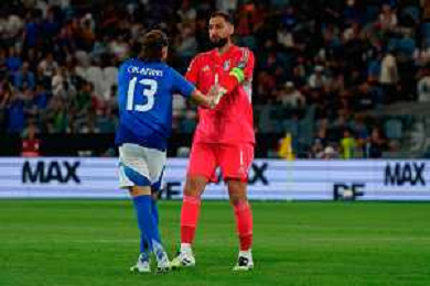 TVEM September 05, 2025 Bergamo, Italy - Italy vs Estonia - European Qualifiers FIFA World Cup 2026 Matchday 5 - Atleti Azzurri d’Italia Stadium. In the pic: Gianluigi Donnarumma of Italy and Riccardo Calafiori of Italy foto emmanuele mastrodonato-ag aldo liverani sas