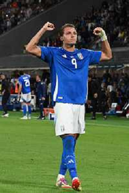 Matteo Retegui of Italy celebrates after scoring second goal during Italy vs Estonia, European Qualifier, 3nd group match, game at New Balance stadium in Bergamo (BG), Italy, on September 05, 2025. (Photo by Davide Casentini)- AGENZIA ALDO LIVERANI SAS