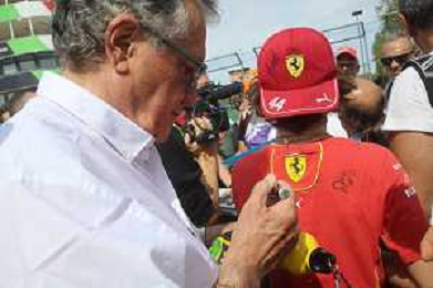 IMOLA 13 09 2025 AUTODROMO ENZO E DINO FERRARI MINARDI DAY NELLA FOTO GIANCARLO MINARDI FIRMA LA MAGLIA A UN TIFOSO DELLA FERRARI NUMERO 44 DI LEWIS HAMILTON FOTO GIANNI SANNA-AG ALDO LIVERANI SAS