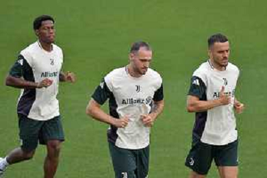 TVMV-Torino 15.09.2025 Continassa © Manuela Viganti/Agenzia Aldo Liverani Allenamento Juventus Rifinitura partita Champions League Juventus vs Borussia Dortmund Nella foto: jonthan david, federico gatti e filip kostic ©TVMV Viganti Manuela - AGENZIA ALDO LIVERANI SAS