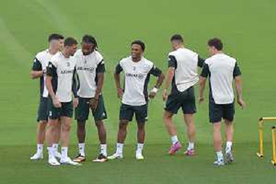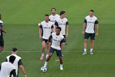 TVMV-Torino 15.09.2025 Continassa © Manuela Viganti/Agenzia Aldo Liverani Allenamento Juventus Rifinitura partita Champions League Juventus vs Borussia Dortmund Nella foto: pierre kalulu, lloyd kelly, edon zhegrova e khephren thuram ©TVMV Viganti Manuela - AGENZIA ALDO LIVERANI SAS