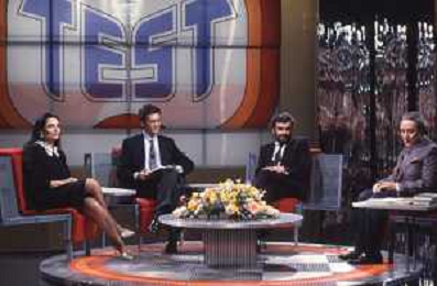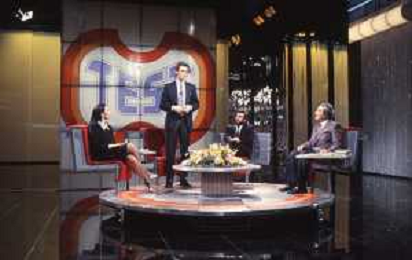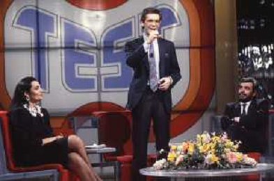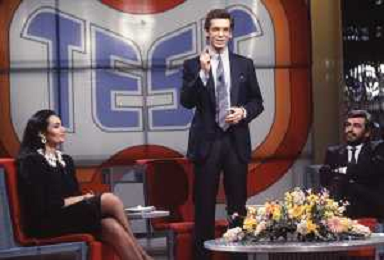 DIAP-RETROSPETTIVA ALESSANDRO CECCHI PAONE PRESENTATORE TELEVISIVO NELLA FOTO ALESSANDRO CECCHI PAONE CONDUCE LA TRASMISSIONE TELEVISIVA “ TEST“ANNO 1986 OSPITI ROSANNA SCHIAFFINO E GIOVANNI GORIA AG ALDO LIVERANI SAS