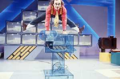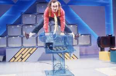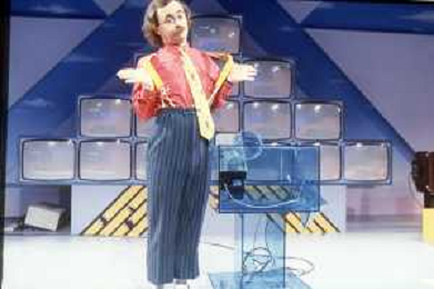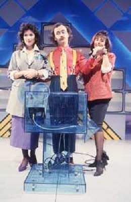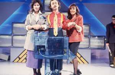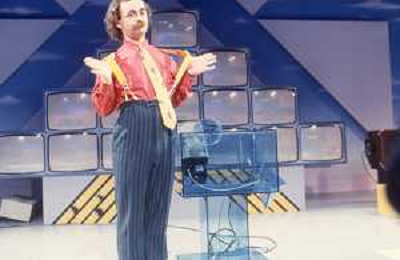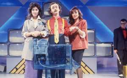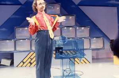 DIAP-RETROSPETTIVA MAURIZIO NICHETTI ATTORE NELLAFOTO MAURIZIO NICHETTI A MILANO NELL'ANNO 1986 NELLA TRASMISSIONE TELEVISIVA “PISTA “ CONDANIELA GOGGI E ORSETTA GREGORETTI AG ALDO LIVERANI SAS