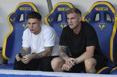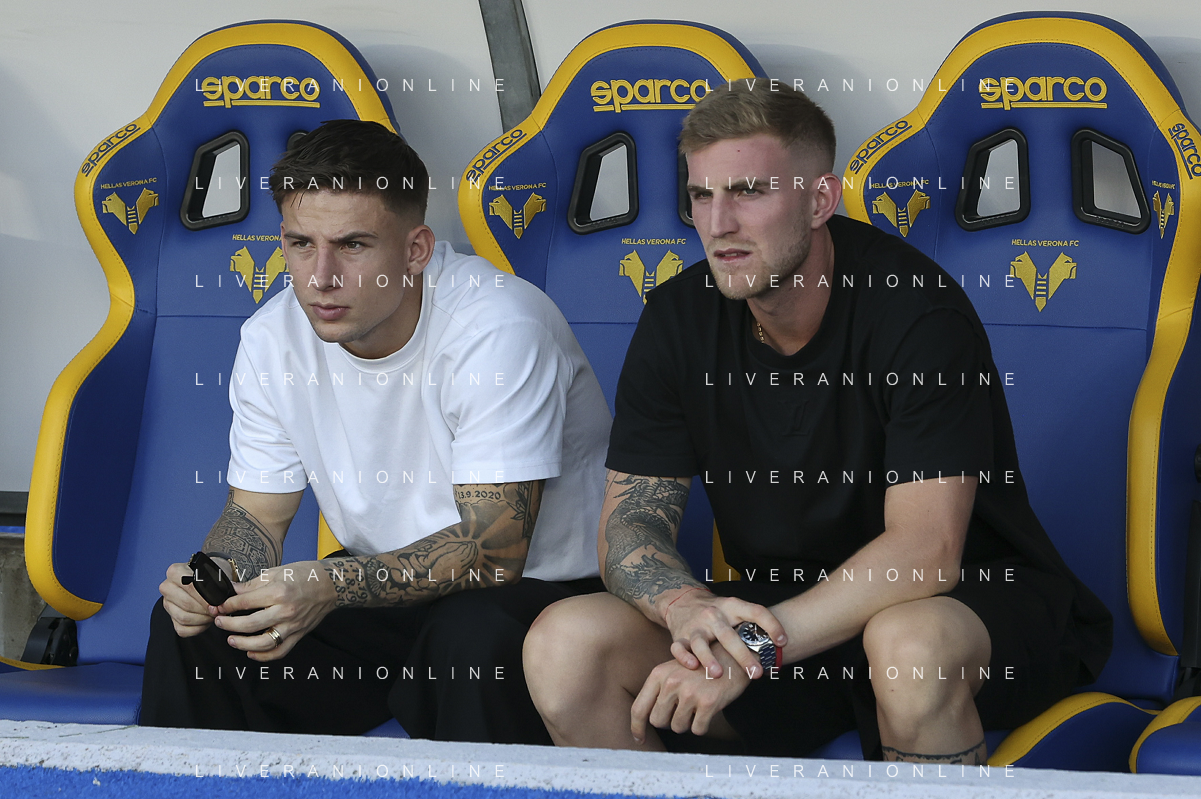 Tomas Suslov of Hellas Verona FC and Nicolas Valentini of Hellas Verona FC during Hellas Verona FC vs Juventus FC, 4° Serie A Enilive 2025-26 game at Marcantonio Bentegodi stadium in Verona (VR), Italy, on September 20, 2025. (Photo by Davide Casentini)- AGENZIA ALDO LIVERANI