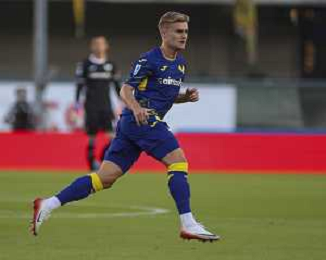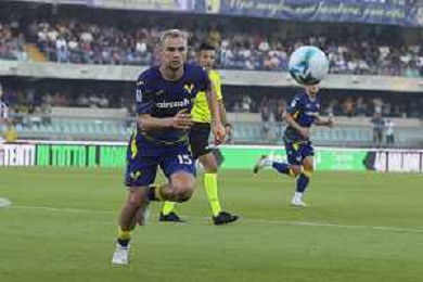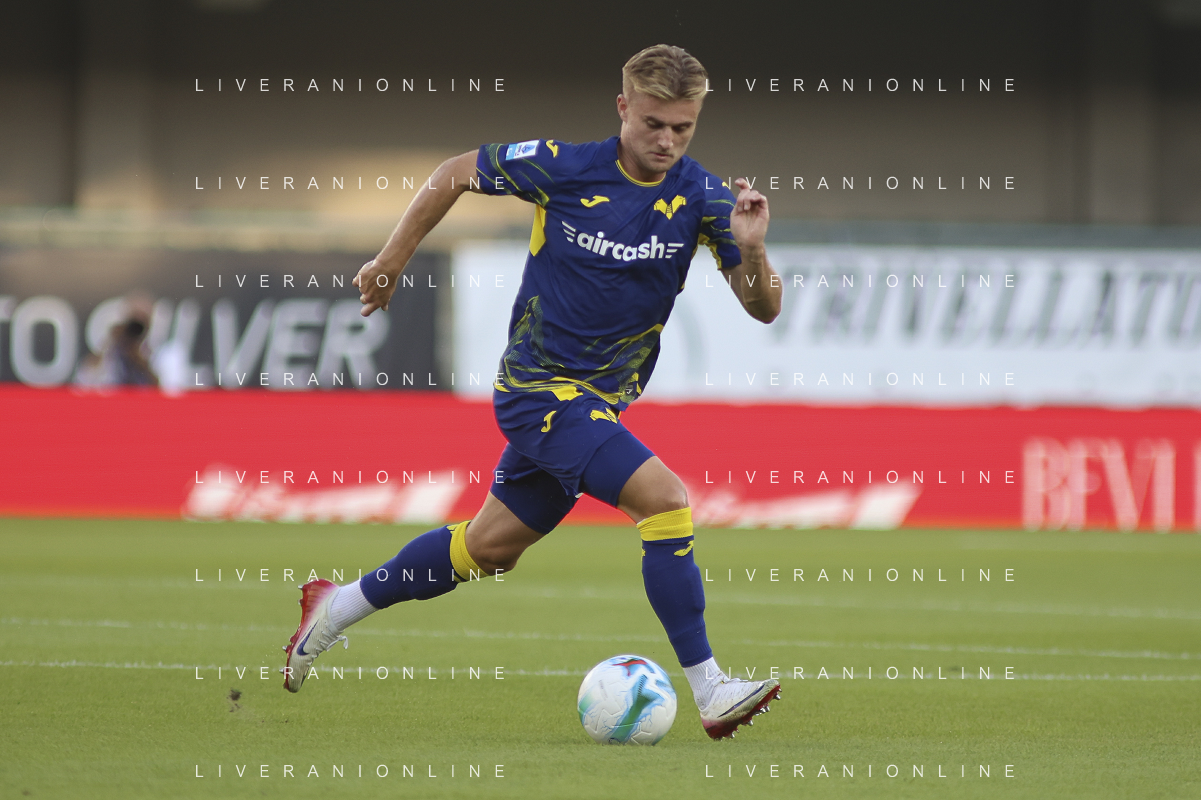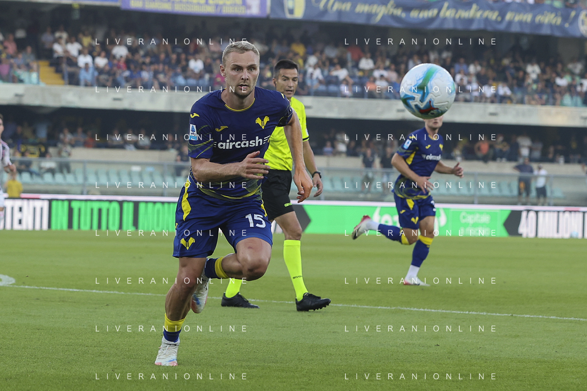 Martin Frese of Hellas Verona FC play the ball during Hellas Verona FC vs Juventus FC, 4° Serie A Enilive 2025-26 game at Marcantonio Bentegodi stadium in Verona (VR), Italy, on September 20, 2025. (Photo by Davide Casentini)- AGENZIA ALDO LIVERANI