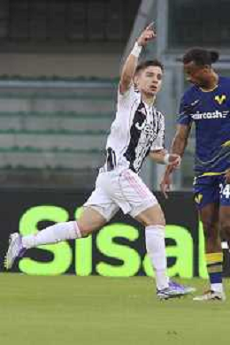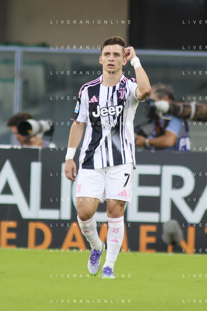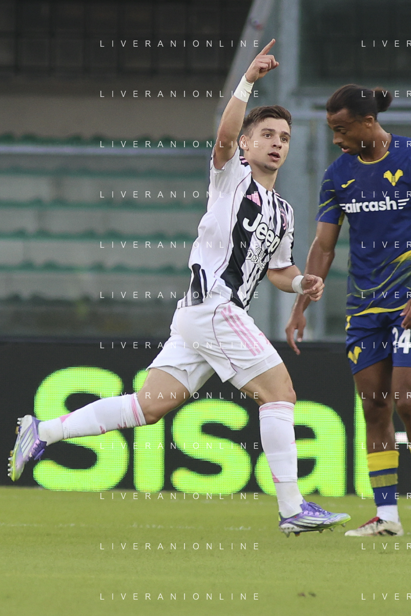Francisco Conceicao of Juventus FC celebrates after scoring during Hellas Verona FC vs Juventus FC, 4° Serie A Enilive 2025-26 game at Marcantonio Bentegodi stadium in Verona (VR), Italy, on September 20, 2025. (Photo by Davide Casentini)- AGENZIA ALDO LIVERANI