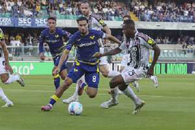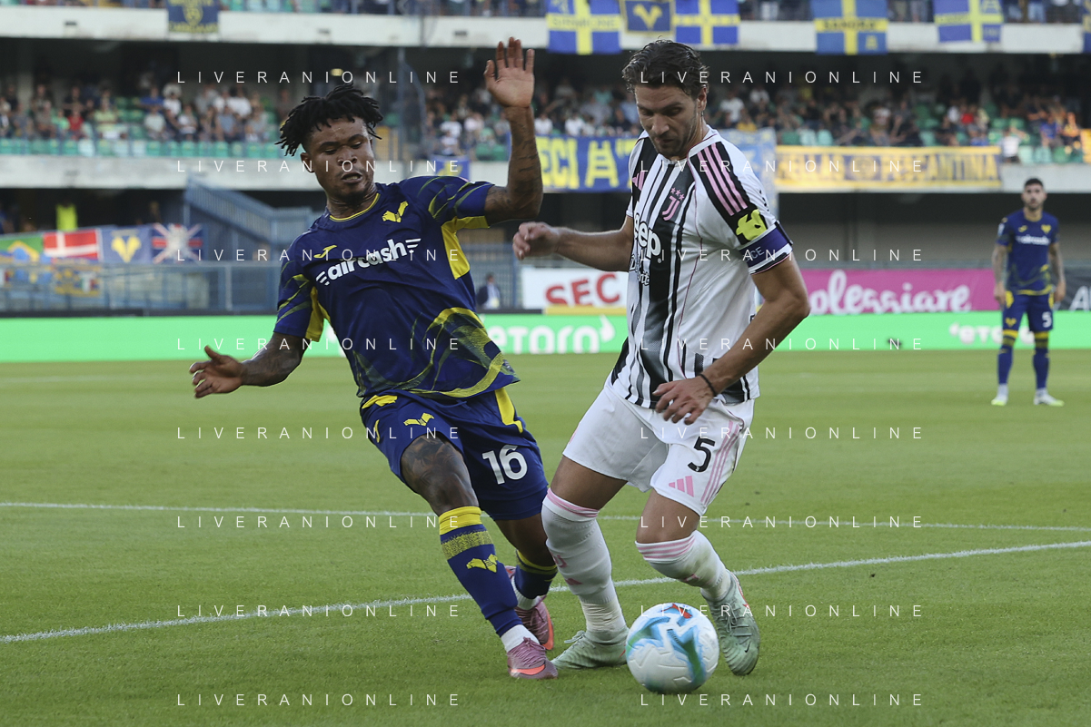 Manuel Locatelli of Juventus FC competes for the ball with Gift Orban of Hellas Verona FC during Hellas Verona FC vs Juventus FC, 4° Serie A Enilive 2025-26 game at Marcantonio Bentegodi stadium in Verona (VR), Italy, on September 20, 2025. (Photo by Davide Casentini)- AGENZIA ALDO LIVERANI