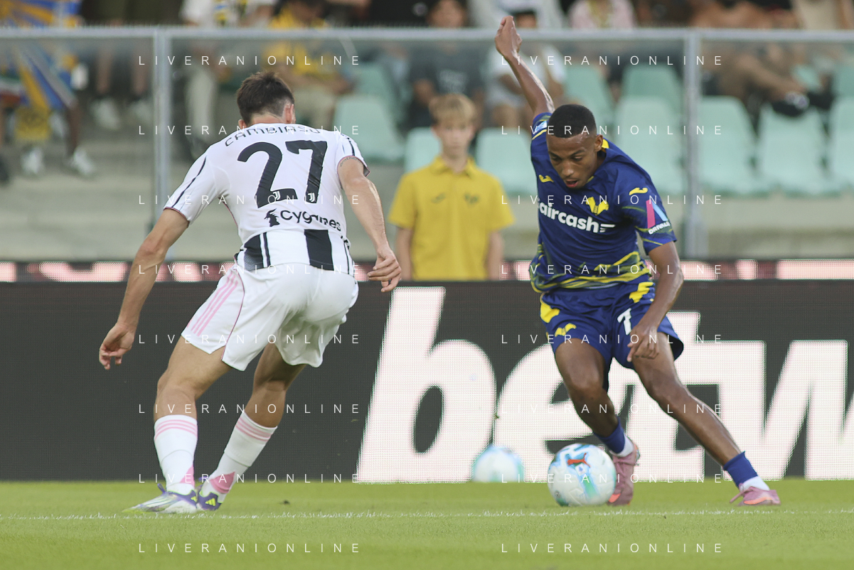 Rafik Belghali of Hellas Verona FC8 battle for the ball with Andrea Cambiaso of Juventus FC during Hellas Verona FC vs Juventus FC, 4° Serie A Enilive 2025-26 game at Marcantonio Bentegodi stadium in Verona (VR), Italy, on September 20, 2025. (Photo by Davide Casentini)- AGENZIA ALDO LIVERANI