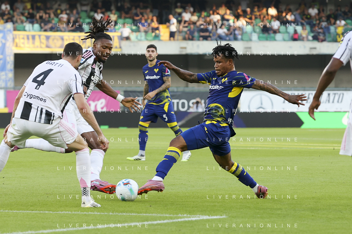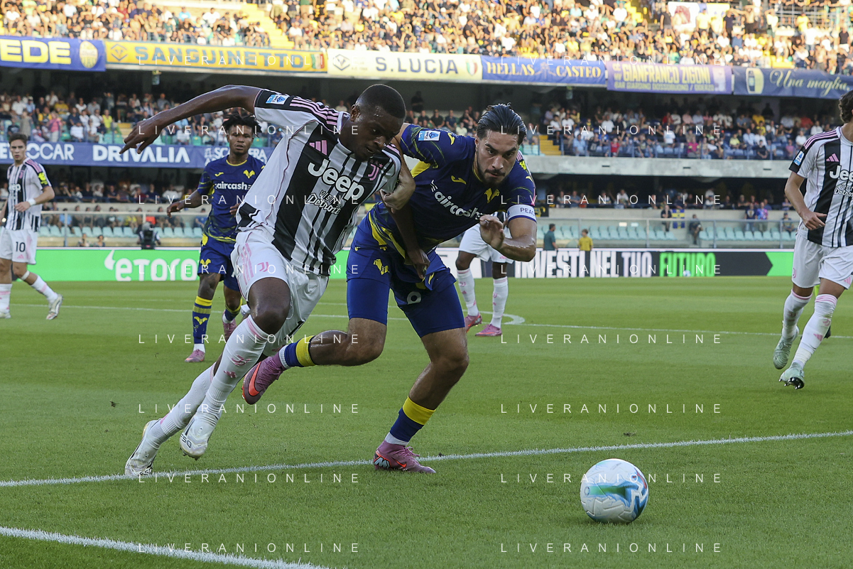 Gift Orban of Hellas Verona FC competes for the ball with Manuel Locatelli of Juventus FC during Hellas Verona FC vs Juventus FC, 4° Serie A Enilive 2025-26 game at Marcantonio Bentegodi stadium in Verona (VR), Italy, on September 20, 2025. (Photo by Davide Casentini)- AGENZIA ALDO LIVERANI