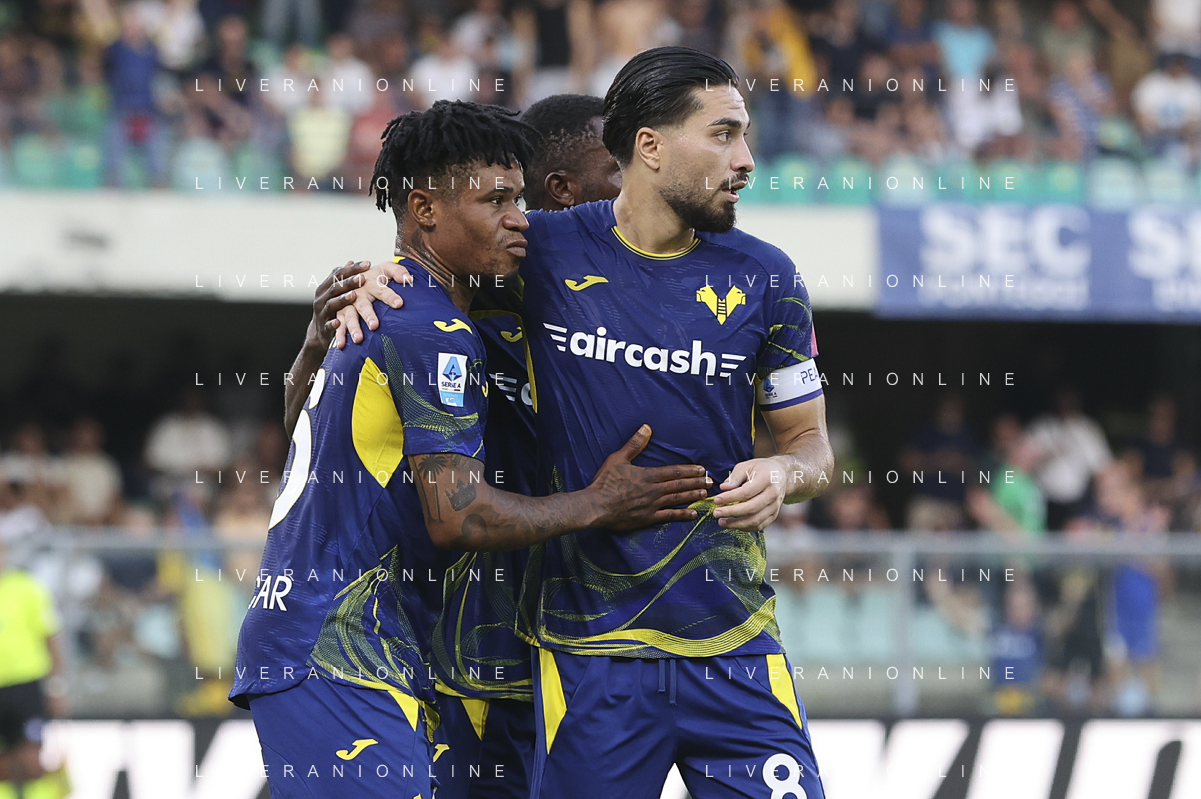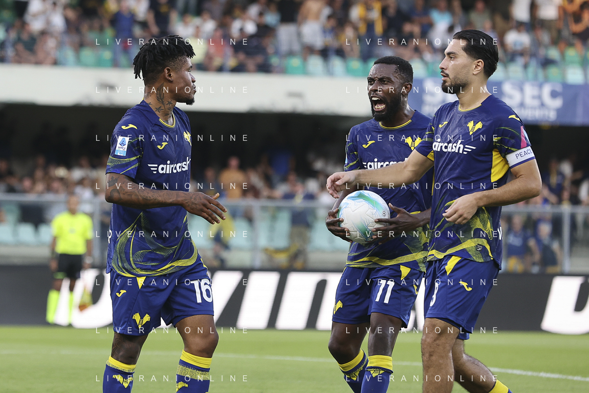 Gift Orban of Hellas Verona FC celebrates after scoring during Hellas Verona FC vs Juventus FC, 4° Serie A Enilive 2025-26 game at Marcantonio Bentegodi stadium in Verona (VR), Italy, on September 20, 2025. (Photo by Davide Casentini)- AGENZIA ALDO LIVERANI