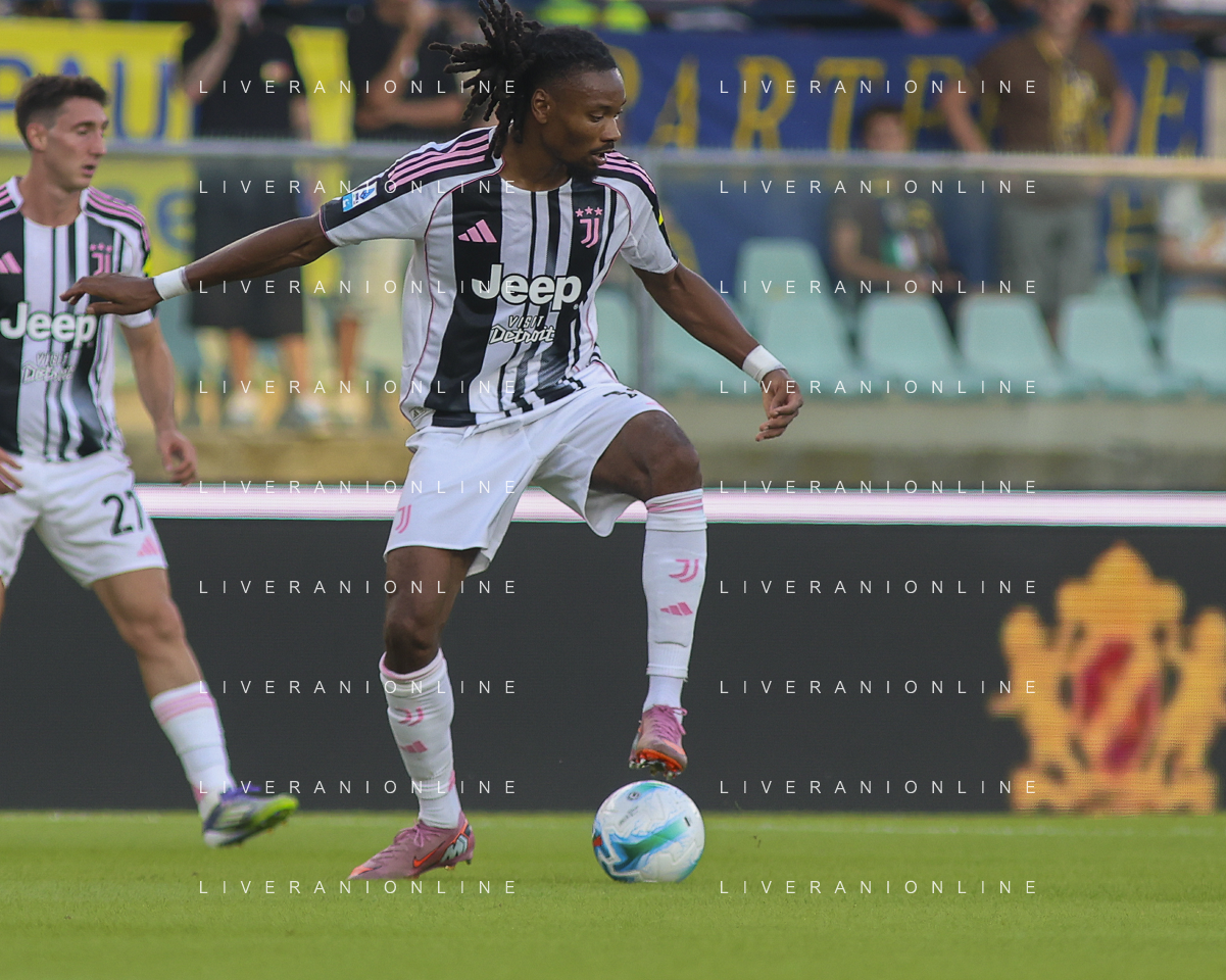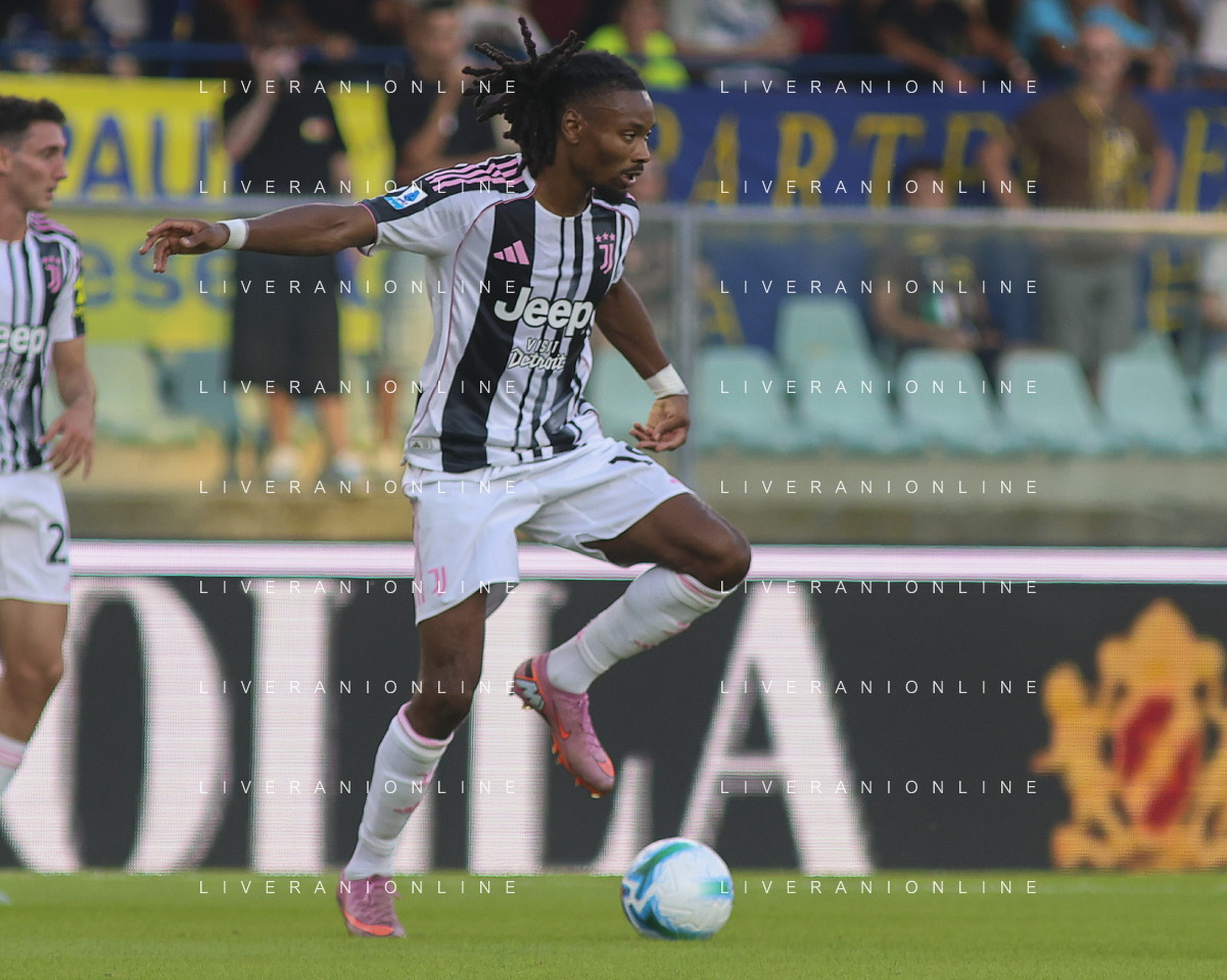 Khephren Thuram of Juventus FC play the ball during Hellas Verona FC vs Juventus FC, 4° Serie A Enilive 2025-26 game at Marcantonio Bentegodi stadium in Verona (VR), Italy, on September 20, 2025. (Photo by Davide Casentini)- AGENZIA ALDO LIVERANI