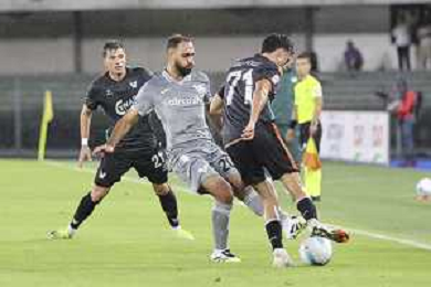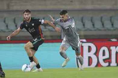 Grigoris Kastanos of Hellas Verona FC battle for the ball with Kike Pérez of Venezia FC during Hellas Verona FC vs Venezia FC, 16° leg of Coppa Italia Frecciarossa 2025-26 game at Marcantonio Bentegodi stadium in Verona (VR), Italy, on September 24, 2025. (Photo by Davide Casentini)- AGENZIA ALDO LIVERANI SAS