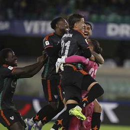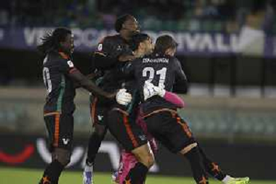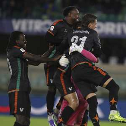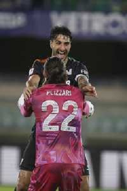 Alessandro Plizzari of Venezia FC celebrates with Alessandro Plizzari of Venezia FC the victory during Hellas Verona FC vs Venezia FC, 16° leg of Coppa Italia Frecciarossa 2025-26 game at Marcantonio Bentegodi stadium in Verona (VR), Italy, on September 24, 2025. (Photo by Davide Casentini)- AGENZIA ALDO LIVERANI SAS