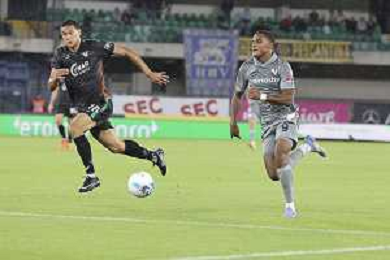 Fallou Cham of Hellas Verona FC competes for the ball with Antonio Casas of Venezia FC during Hellas Verona FC vs Venezia FC, 16° leg of Coppa Italia Frecciarossa 2025-26 game at Marcantonio Bentegodi stadium in Verona (VR), Italy, on September 24, 2025. (Photo by Davide Casentini)- AGENZIA ALDO LIVERANI SAS