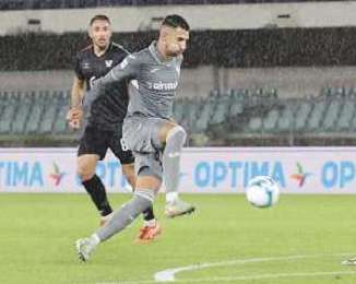 Amin Sarr of Hellas Verona FC play the ball during Hellas Verona FC vs Venezia FC, 16° leg of Coppa Italia Frecciarossa 2025-26 game at Marcantonio Bentegodi stadium in Verona (VR), Italy, on September 24, 2025. (Photo by Davide Casentini)- AGENZIA ALDO LIVERANI SAS