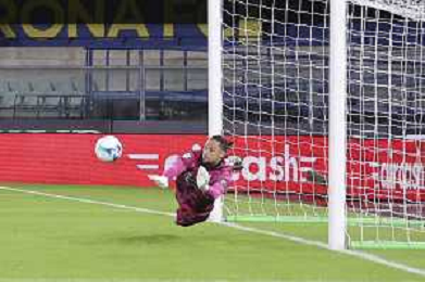Alessandro Plizzari of Venezia FC makes a save on penalty during Hellas Verona FC vs Venezia FC, 16° leg of Coppa Italia Frecciarossa 2025-26 game at Marcantonio Bentegodi stadium in Verona (VR), Italy, on September 24, 2025. (Photo by Davide Casentini)- AGENZIA ALDO LIVERANI SAS