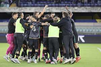 Venezia players celebrate the victory at the end of Hellas Verona FC vs Venezia FC, 16° leg of Coppa Italia Frecciarossa 2025-26 game at Marcantonio Bentegodi stadium in Verona (VR), Italy, on September 24, 2025. (Photo by Davide Casentini)- AGENZIA ALDO LIVERANI SAS
