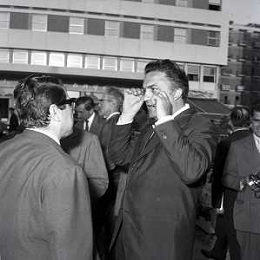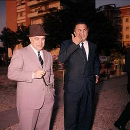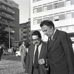 COL-Federico Fellini regista, sceneggiatore, scrittore e fumettista italiano - Retrospettiva nella foto Cocktail all'aperto in una zona di periferia davanti all'Hotel dei Congressi per il film ' Boccaccio '70 ' a Roma nel 1962 con Carlo Ponti FOTO SANDRO VESPASIANI/ AGENZIA ALDO LIVERANI SAS