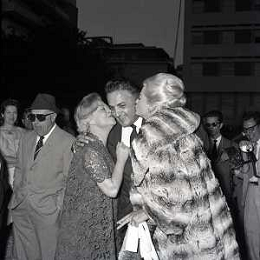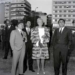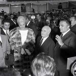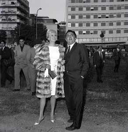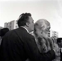 NEG-Federico Fellini regista, sceneggiatore, scrittore e fumettista italiano - Retrospettiva nella foto Cocktail all'aperto in una zona di periferia davanti all'Hotel dei Congressi per il film ' Boccaccio '70 ' a Roma nel 1962 con la moglie Giulietta Masina e Anita Ekberg FOTO SANDRO VESPASIANI/ AGENZIA ALDO LIVERANI SAS