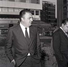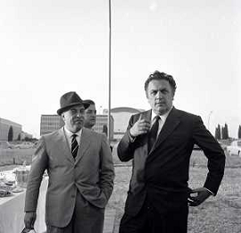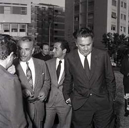 NEG-Federico Fellini regista, sceneggiatore, scrittore e fumettista italiano - Retrospettiva nella foto Cocktail all'aperto in una zona di periferia davanti all'Hotel dei Congressi per il film ' Boccaccio '70 ' a Roma nel 1962 con Carlo Ponti FOTO SANDRO VESPASIANI/ AGENZIA ALDO LIVERANI SAS