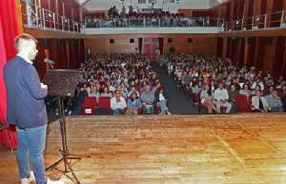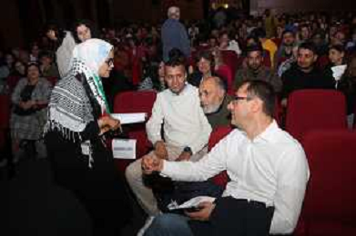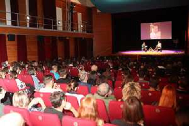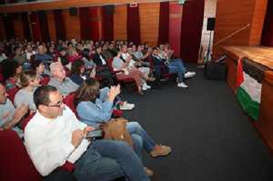 IMOLA TEATRO OSSERVANZA INCONTRO PUBBLICO PER GAZA COLLEGAMENTO CON GIORNALISTA LORENZO D'AGOSTINO CHE SI TROVA SU BORDO GLOBAL SUMUD FLOTILLA CHE VA VERSO GAZA NELLA FOTO IN PRIMA FILA PRESENTI SINDACO MARCO PANIERI,ASSESSORI ELISA SPADA,GIANNA GAMBETTI,GIACOMO GAMBI ©SANNA - AGENZIA ALDO LIVERANI SAS