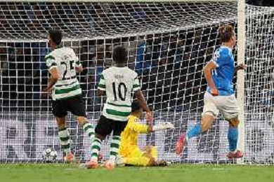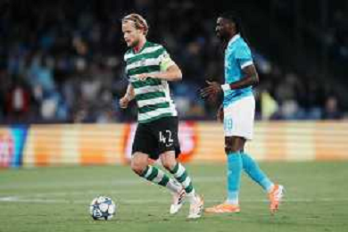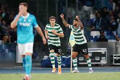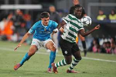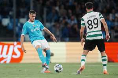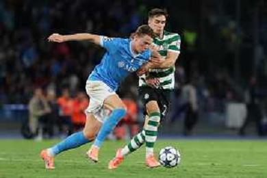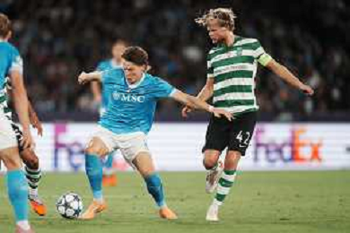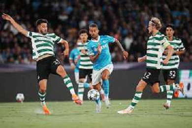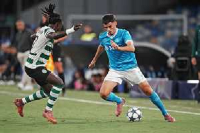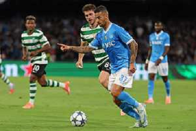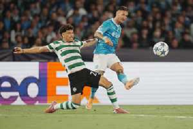 TVPM Napoli, Sporting Lisbona Nella Foto: Miguel Gutierrez Foto Mosca, Ag.Liverani- AGENZIA ALDO LIVERANI SAS -TVPM Napoli - Sporting Lisbona UEFA Champions League 2a Giornata 01.10.2025