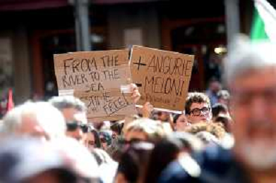 IMOLA 03 10 2025 PROTESTA PER PALESTINA LIBERA E PER LA FLOTILLA VERSO GAZA E SCIOPERO GENERALE CGIL IMOLA IN DIFESA DI FLOTILLA PER GAZA NELLA FOTO LE SCRITEE CONTRO IL GOVERNO ©SANNA - AGENZIA ALDO LIVERANI SAS