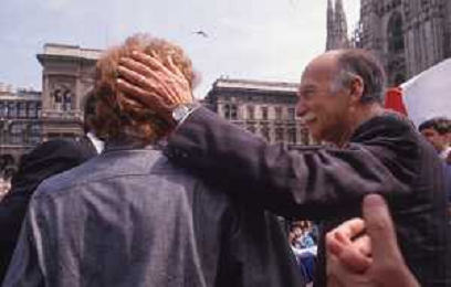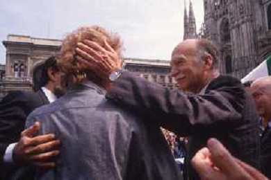 DIAP-RETROSPETTIVA GIORGIO ALMIRANTE POLITICO NELLA FOTO GIORGIO ALMIRANTE IN PIAZZA DUOMO A MILANO NELL'ANNO 1987 CON LA MADRE DI FAUSTO TINELLI AG ALDO LIVERANI SAS