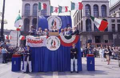 DIAP-RETROSPETTIVA GIORGIO ALMIRANTE POLITICO NELLA FOTO GIORGIO ALMIRANTE IN PIAZZA DUOMO A MILANO NELL'ANNO 1987 CON LA MADRE DI FAUSTO TINELLI E FRANCO SERVELLO AG ALDO LIVERANI SAS