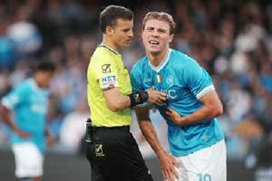 TVPM Napoli, Genoa Nella foto: Arbitro La Penna, Rasmus Hojlund Foto Mosca, Ag.Liverani- AGENZIA ALDO LIVERANI SAS -TVPM Napoli - Genoa Campionato Calcio Serie A 05.10.2025