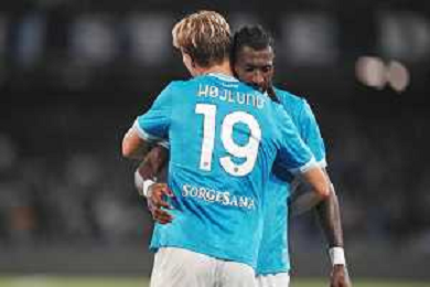 TVPM Napoli, Genoa Nella foto: esultanza Rasmus Hojlund con Frank Anguissa Foto Mosca, Ag.Liverani- AGENZIA ALDO LIVERANI SAS -TVPM Napoli - Genoa Campionato Calcio Serie A 05.10.2025