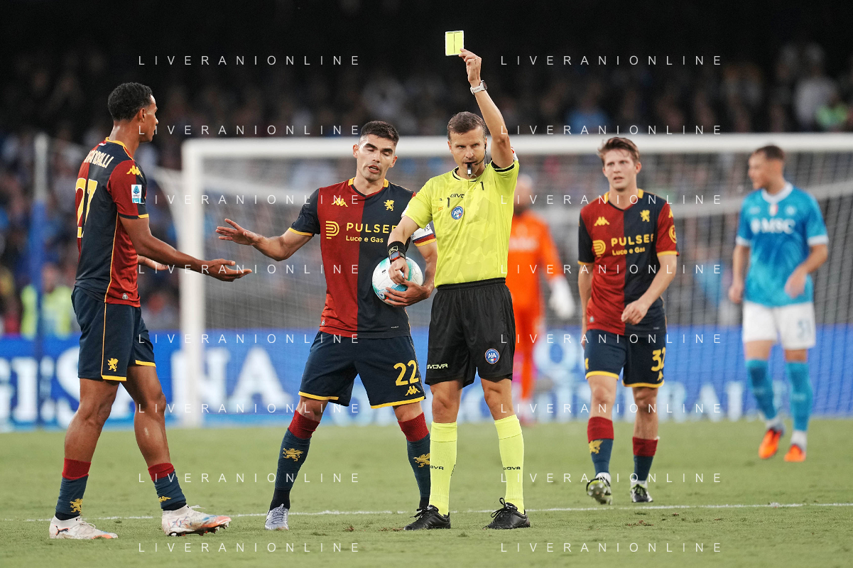 TVPM Napoli, Genoa Nella foto: Arbitro La Penna ammonisce Alessandro Marcandalli Foto Mosca, Ag.Liverani- AGENZIA ALDO LIVERANI SAS -TVPM Napoli - Genoa Campionato Calcio Serie A 05.10.2025