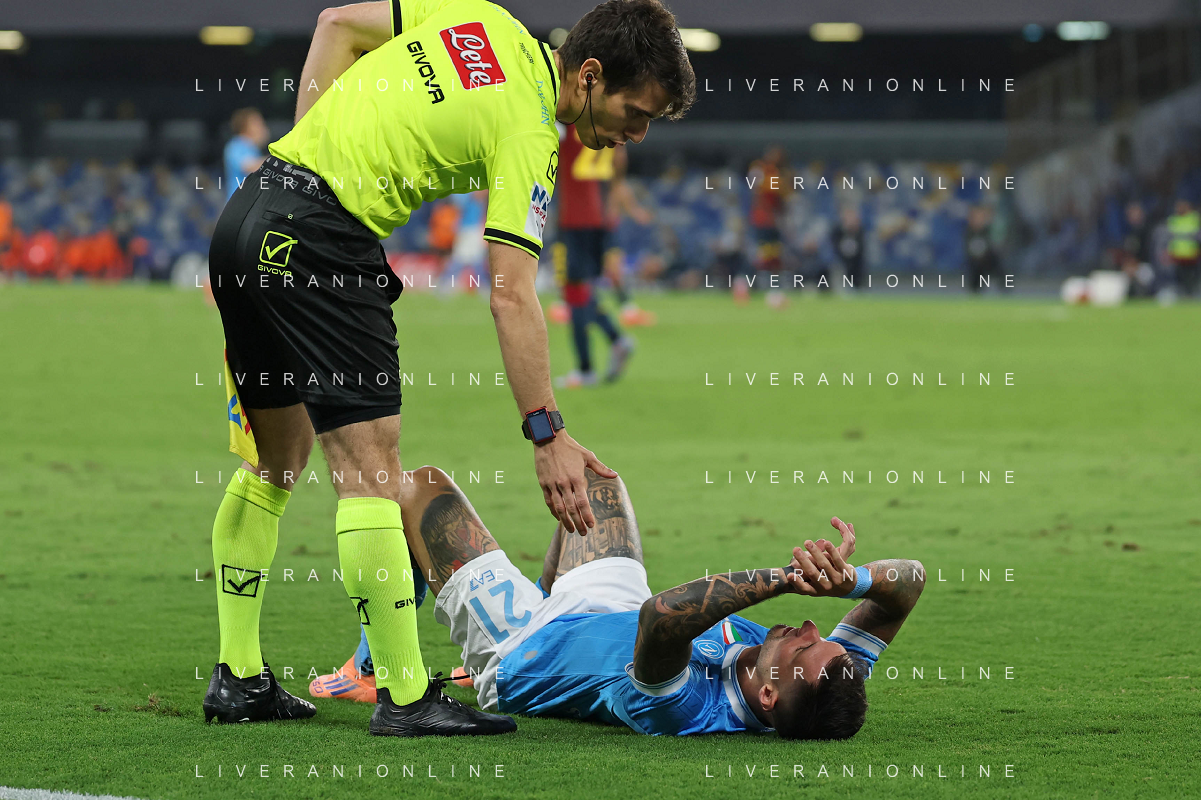 TVPM Napoli, Genoa Nella foto: infortunio Matteo Politano Foto Mosca, Ag.Liverani- AGENZIA ALDO LIVERANI SAS -TVPM Napoli - Genoa Campionato Calcio Serie A 05.10.2025