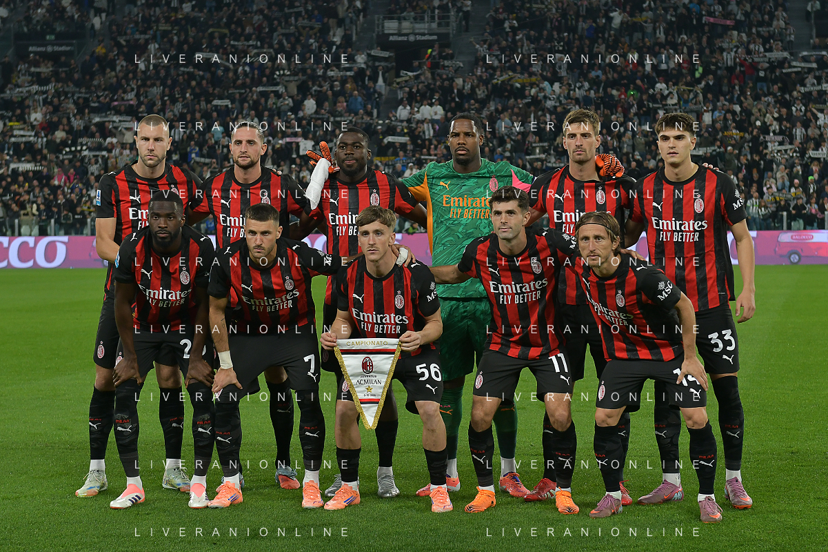 Torino 05.10.2025 Allianz Stadium @Manuela Viganti /Ag. Aldo Liverani sas Juventus vs Milan Campionato Calcio Serie A Enilive 2025/2026 6a giornata Nella foto: la formazione del milan da sx verso dx: strahinja pavlovic, adrien rabiot, youssouf fofana, mike maignan, matteo gabbia, davide bartesaghi, fikayo tomori, santiago gimenez, alexis saelemaekers, cristian pulisic, luka modric