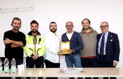 IMOLA 07 10 2025 CENTRO SOCIALE LA STALLA CONFERENZA STAMPA CONSEGNA DI DEFIBRILLATORE DA PARTE DI ASS.NEVER GIVE UP IN MEMORIA A NICOLA USSIA AL CENTRO SOCIALE LA STALLA NELLA FOTO DA DESTRA DAVIDE COLLINA PRES LA STALLA,ALFONSO BOTIGLIERI PRES ASS BOF,ASSESSORE PIERANGELO RAFFINI,ANTONIO USSIA ASS NEVER GIVE UP,NICOLA TANCREDI RESP INFERMIERISTICO 118 E RODOLFO FERRARI PRIMARIO 118 ©SANNA - AGENZIA ALDO LIVERANI SAS