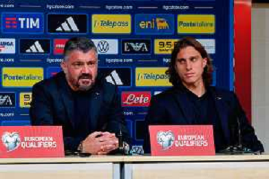 TVEM Gennaro Gattuso head coach of Italy and Riccardo Calafiori of Italy during a press conference at A. Le Coq Arena on October 10, 2025 in Tallinn, Estonia. ©TVEM Emmanuele Mastrodonato - AG ALDO LIVERANI SAS