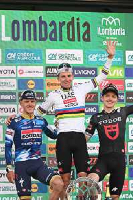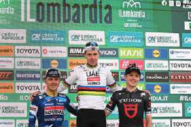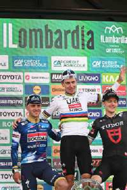 11-10-2025 Giro Di Lombardia; 2025, Uae Team Emirates - Xrg; 2025, Soudal - Quick Step; 2025, Tudor; Pogacar, Tadej; Evenepoel, Remco; Storer, Michale; Bergamo; ©SIROTTI - AG ALDO LIVERANI SAS