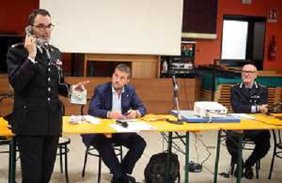IMOLA 13 10 2025 CENTRO SOCIALE CAMPANELLA INCONTRO PUBBLICO DI SENZIBILIZZAZIONE PER IL CONTRASTO ALLE TRUFFE AGLI ANZIANI NELLA FOTO MAGGIORE DEI CARABINIERI DOMENICO LAVIGNA COMMANDANTE STAZIONE DEI CARABINIERI DI IMOLA DIMOSTRA LA TRUFFA TRAMITE TELEFONO,SINDACO MARCO PANIERI E COMMANDANTE POLIZIA LOCALE MASSIMILIANO GALLONI ©SANNA - AGENZIA ALDO LIVERANI SAS