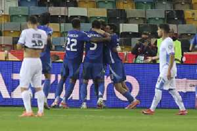 mateo Retegui of Italy celebrates with team mate during Italy vs Israel, European Qualifier, Group I, matchday 8, game at Bluenergy stadium in Udine (UD), Italy, on October 14, 2025. (Photo by Davide Casentini) ©TVDC Casentini Davide - AGENZIA ALDO LIVERANI SAS