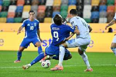 Mateo Retegui of Italy competes for the ball with Guy Mizrahi of Israelb during Italy vs Israel, European Qualifier, Group I, matchday 8, game at Bluenergy stadium in Udine (UD), Italy, on October 14, 2025. (Photo by Davide Casentini) ©TVDC Casentini Davide - AGENZIA ALDO LIVERANI SAS