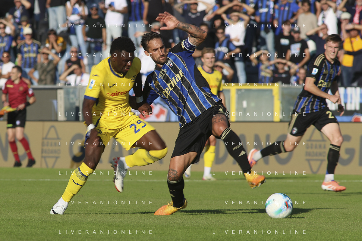 Ebenezer Akinsanmiro of Pisa SC competes for the ball with Roberto Gagliardini of Hellas Verona FC during Pisa SC vs Hellas Verona FC, 7° Serie A Enilive 2025-26 game at Arena Garibaldi - Romeo Anconetani stadium in Pisa (PI), Italy, on October 18, 2025. (Photo by Davide Casentini) AG ALDO LIVERANI SAS