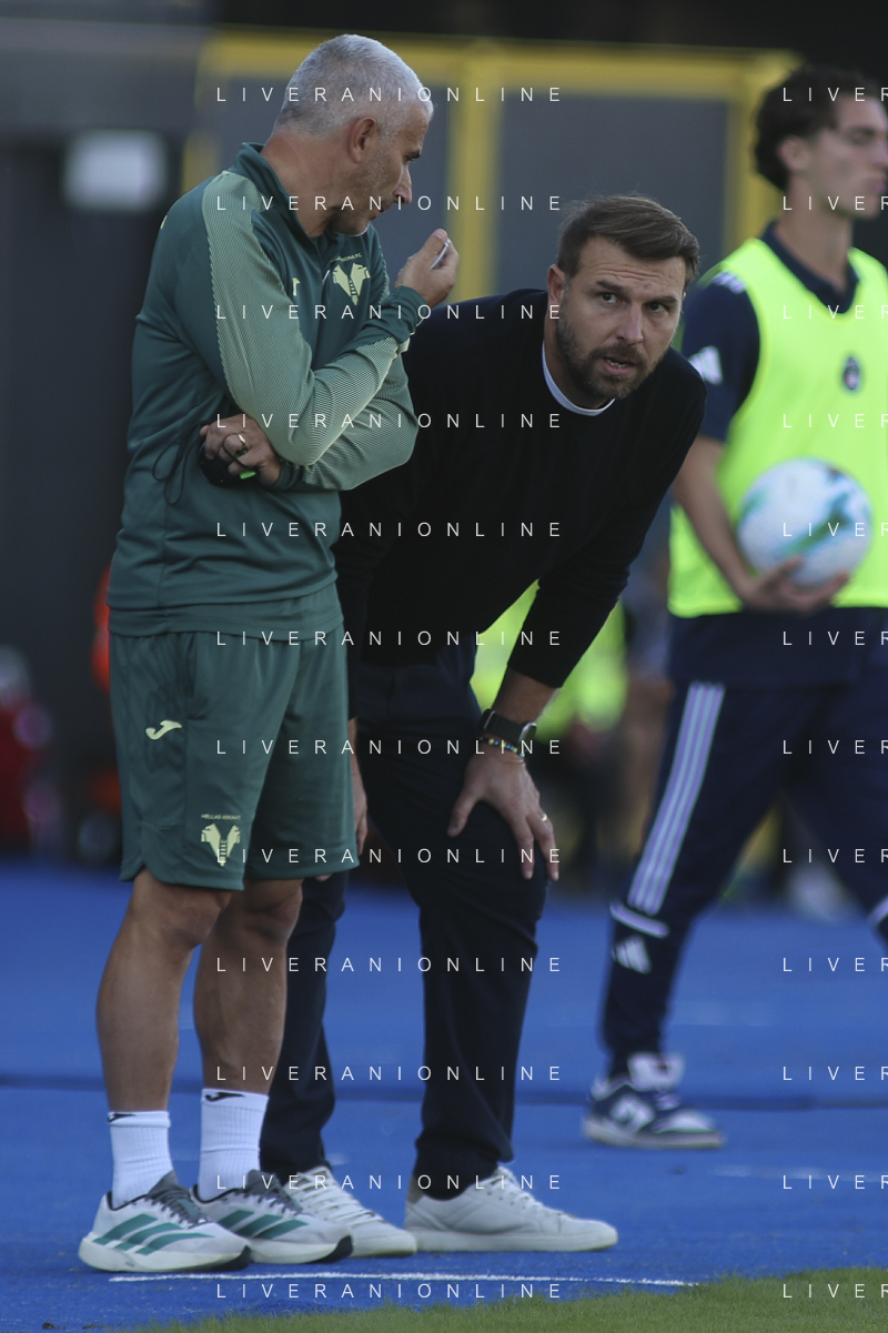 Alberto Bertolini Vice Head Coach of Hellas Verona FC speaks to Paolo Zanetti Head Coach of Hellas Verona FC during Pisa SC vs Hellas Verona FC, 7° Serie A Enilive 2025-26 game at Arena Garibaldi - Romeo Anconetani stadium in Pisa (PI), Italy, on October 18, 2025. (Photo by Davide Casentini) AG ALDO LIVERANI SAS
